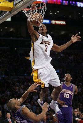 Andrew Bynum had another record breaking game with a new career high (yep, another career high) 28 points and 12 boards. I think the Lakers should trade Kwame Brown (as if anyone wants him) and promote Bynum to the starting role permanently. Jackson is probably open to it, I just want him to be hard on him so that he keeps his composure and his head in the game. Kobe Bryant had another 30+ night with 38 [points and 7 assists. Bryant is helping guys like Ariza and Bynum continue to grow and become more confident on offense. Lamar Odom had 15 points and 14 boards. Another night of solid basketball for Odom. With what should be the Lakers new three headed monster (Kobe, Bynum and Odom), this is all Odom has to do on a nightly basis to be effective. The Lakers and the Suns starters all ended up with double figures, but the scoring of Bryant and Bynum powered them to the top.
